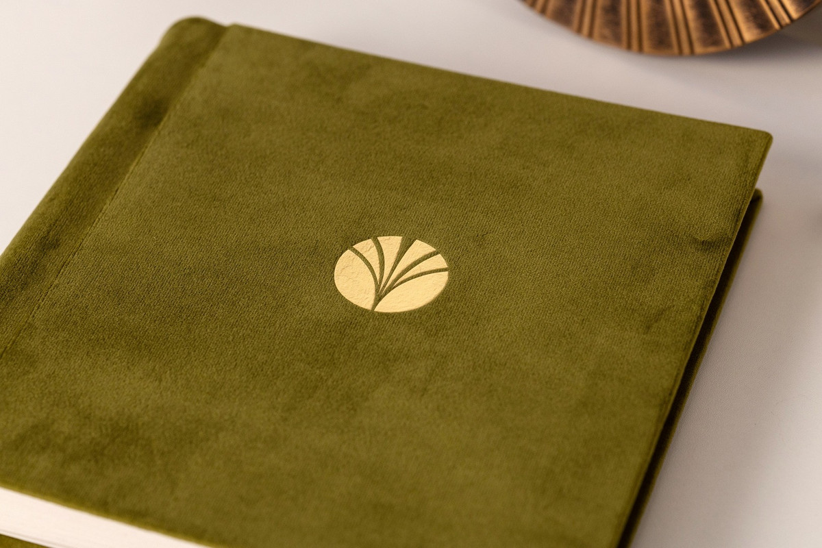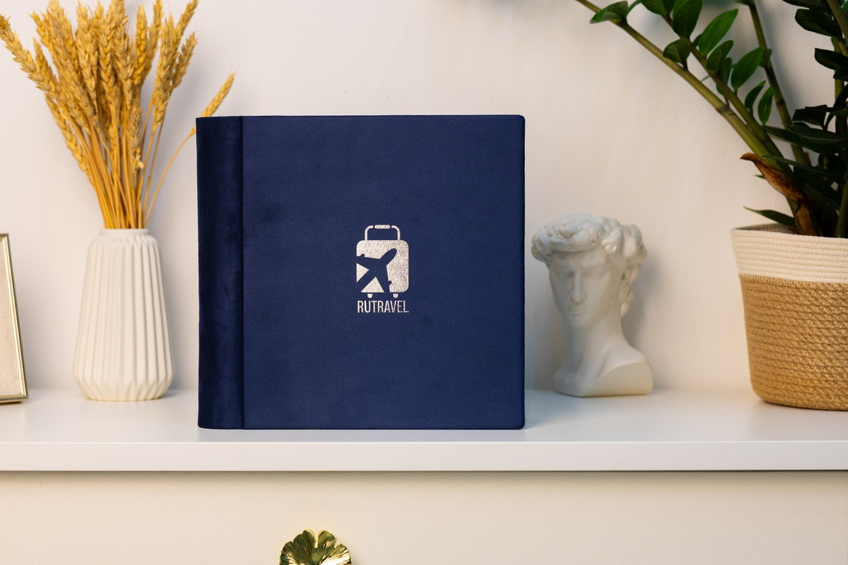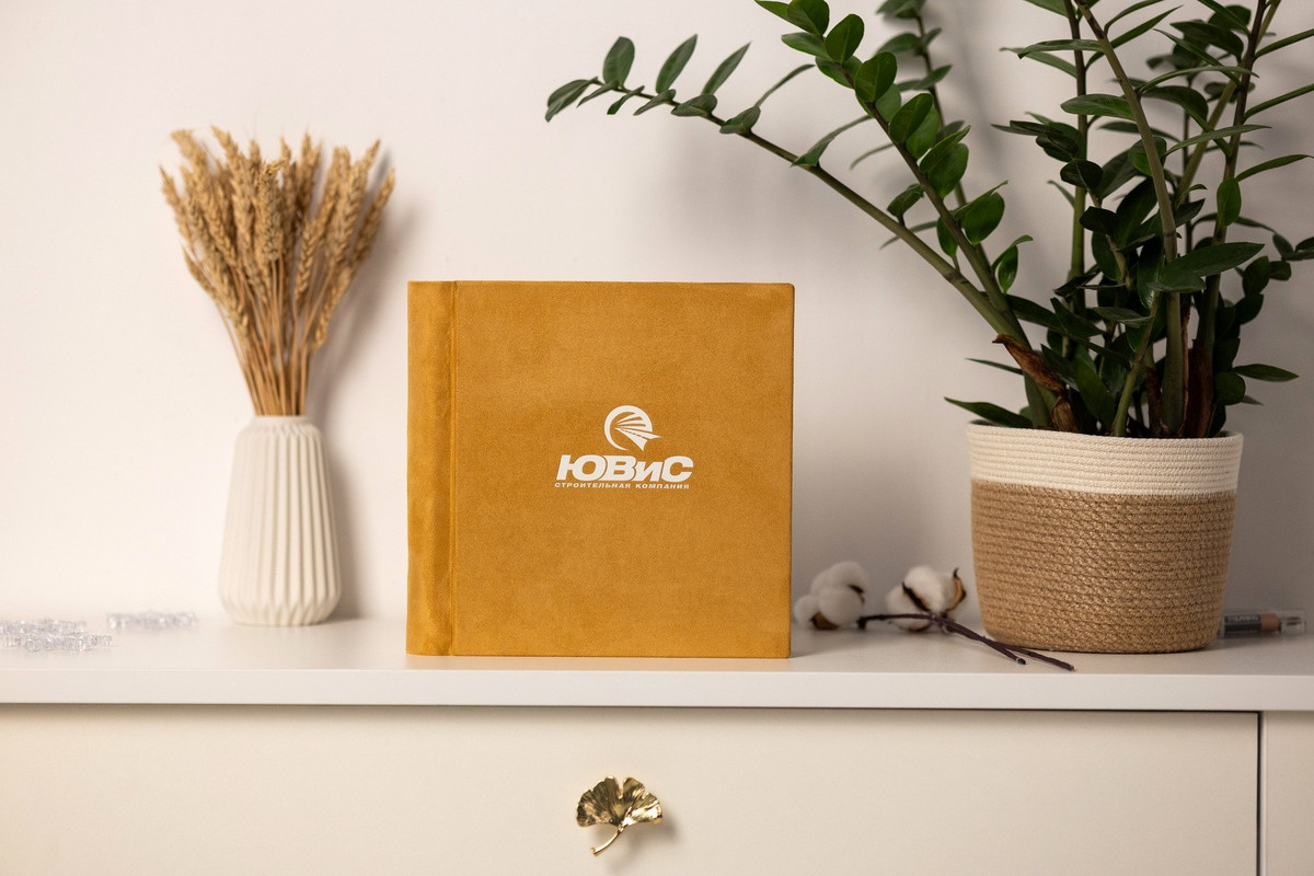 Каждый альбом разрабатывается с учётом фирменного стиля и корпоративной айдентики — от подбора материалов и цвета до нанесения логотипа и индивидуальных надписей.